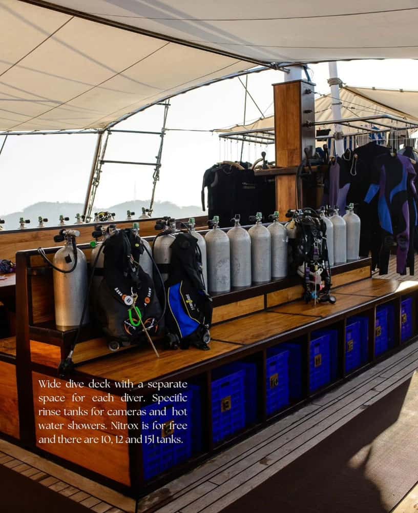 The Samambaia is fitted with all the features of a modern dive liveaboard. With a powerful marine engine, which can reach up to 10 knots cruising speed, it’s the best way to explore the Banda Sea. During the design process the focus was on the details which make it such a great boat. Functionality is paired with aesthetics and quality materials. The layout of the ship was built around the needs of the guests. Comfort and service are of highest priority on board, while the atmosphere is relaxed and cozy. The boat offers many areas for both social activity and private time. A large sundeck with a removable shade cover when the sun gets too hot.